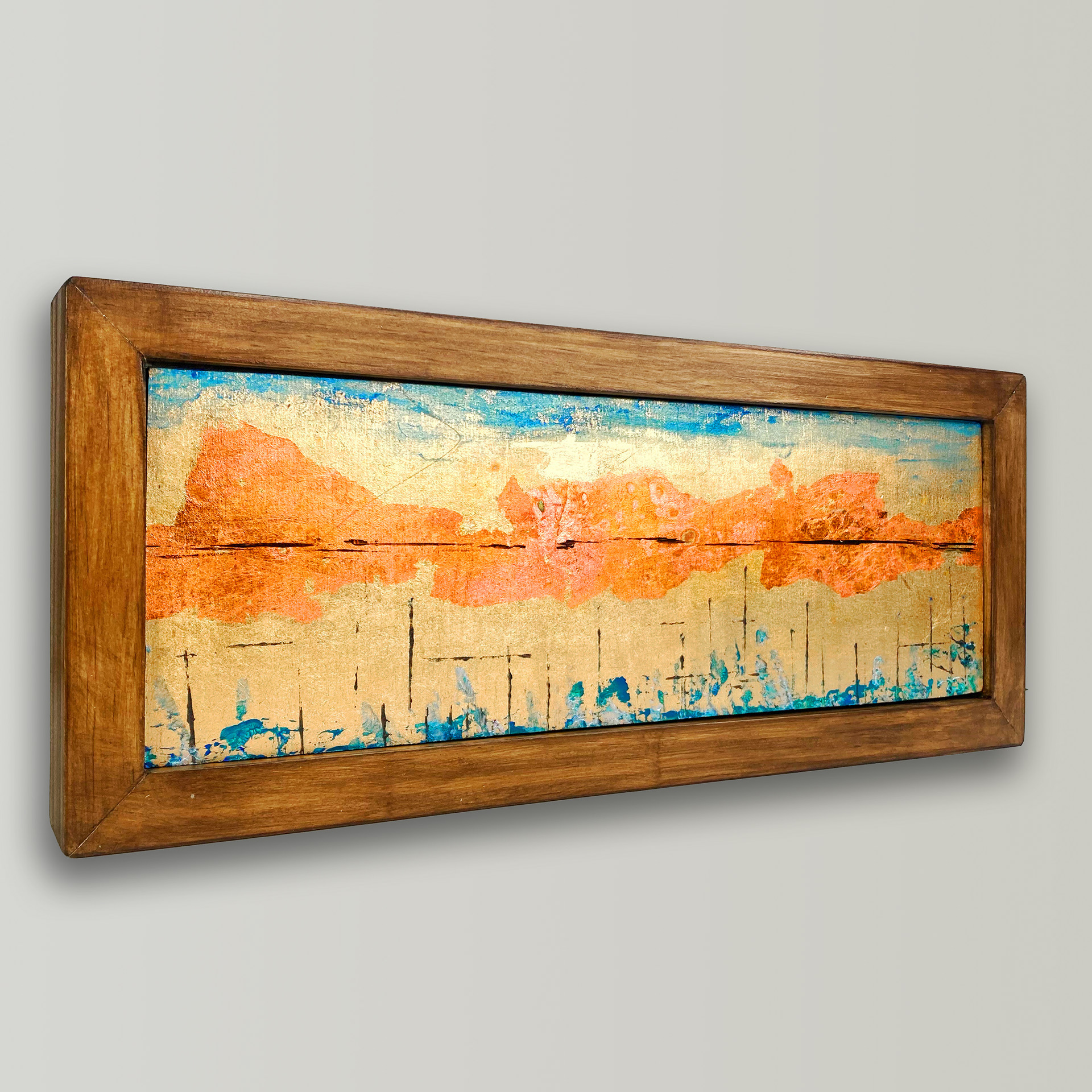 4x12" in handmade frame. Mixed media and metal leaf. $180