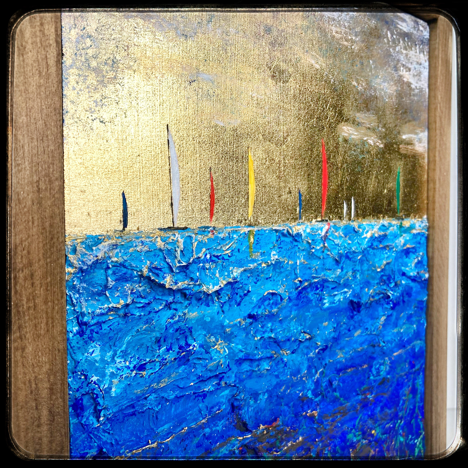 9x12" in handmade frame. Mixed media and metal leaf. $380